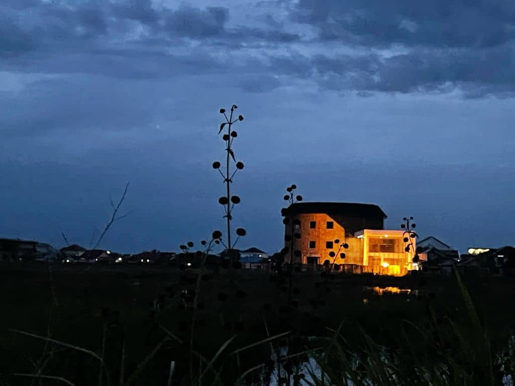 Dinding batubata sengaja tanpa plester. Batubata yang dipakai berasal dari kota Singkawang.