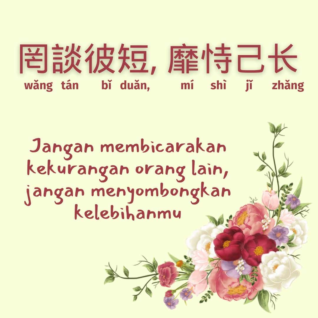Artinya, jangan membicarakan kekurangan orang lain, dan jangan mengandalkan kekuatan sendiri.