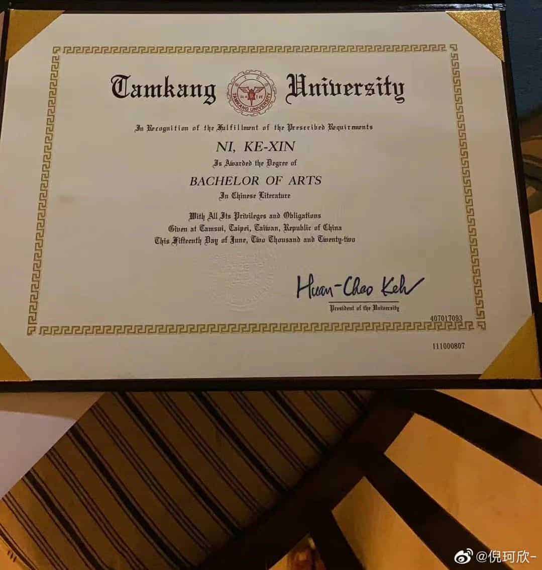 Ni Kexin 倪珂欣 merayakan kelulusannya saat ia mendapatkan gelar Bachelor of Arts dalam sastra Tiongkok dari Universitas Tamkang.