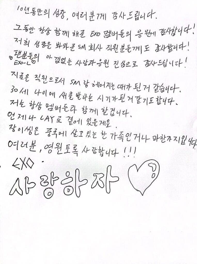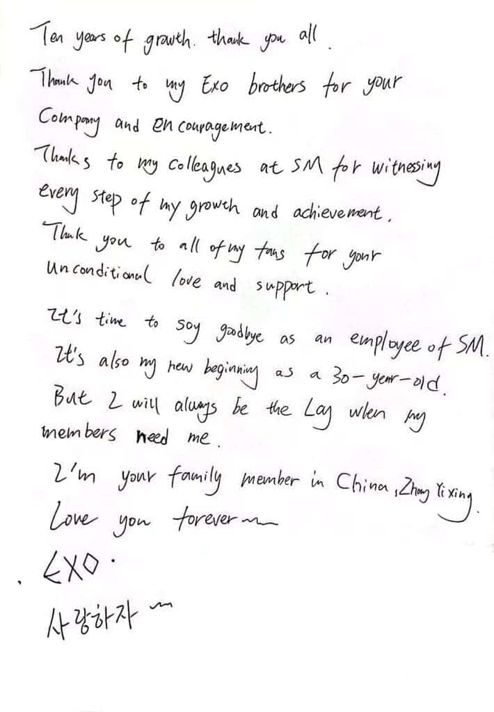 Tepat 10 tahun anniversary debutnya, Lay Zhang (Zhang Yixing) umumkan kontraknya dengan SM Entertainment telah berakhir dan ia telah resmi meninggal agensi tersebut.